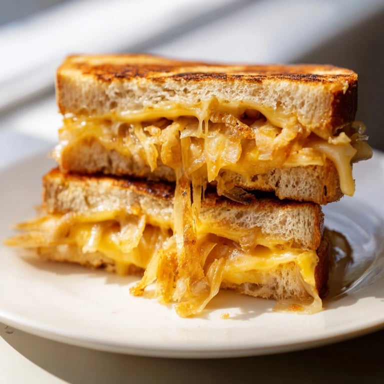 Save to Pinterest The smell of onions sizzling in hot oil used to drive my college roommate crazy in the best way. She'd wander into our tiny apartment kitchen, drawn by the sound of that unmistakable crackle, and find me hovering over the stove with a slotted spoon. I was experimenting with ways to make grilled cheese feel less like lazy dinner and more like something worth sitting down for. That's when I started tucking crispy fried onions between the cheese layers, and suddenly our Thursday night ritual had a waiting list.