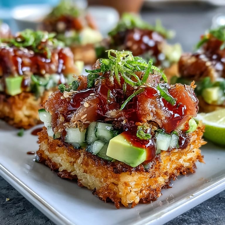 I first made this for a few friends after a sweaty afternoon spent debating the best sushi rolls in town. We stood around the kitchen island, grabbing pieces of the crispy rice with our fingers and piling on toppings. There were so many half-serious arguments about whether to sprinkle more sesame seeds or add even more sriracha, but silence always returned as soon as we started eating. There was laughter and a bit of competitive assembling—who could pile their square the highest. It became our unofficial tradition anytime someone craved something fresh but with a bit of a punch.