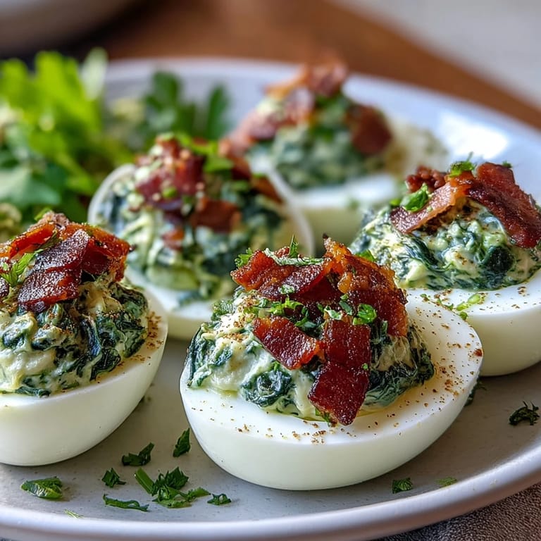 Save to Pinterest The magic of this recipe lies in the brilliant green filling that transforms ordinary deviled eggs into something extraordinary. Fresh baby spinach is wilted just until tender, then blended with creamy egg yolks, tangy Dijon mustard, and bright lemon juice to create a filling that's as nutritious as it is beautiful. The addition of fresh chives brings a subtle onion flavor that complements the earthiness of the spinach, while the crispy ham topping adds a salty, savory crunch that makes each bite completely addictive. It's a sophisticated twist that proves healthy ingredients can be just as indulgent as traditional recipes.