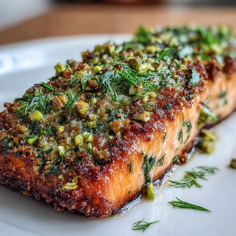 Save to Pinterest The secret to this dish lies in the herb-infused crust. By combining finely chopped pistachios with fresh parsley, dill, and a touch of lemon zest, you create a layer of flavor that enhances the natural richness of the fish. Pan-searing the crust-side down first ensures that the topping becomes beautifully golden and crisp, sealing in the juices of the salmon for a perfectly cooked finish.